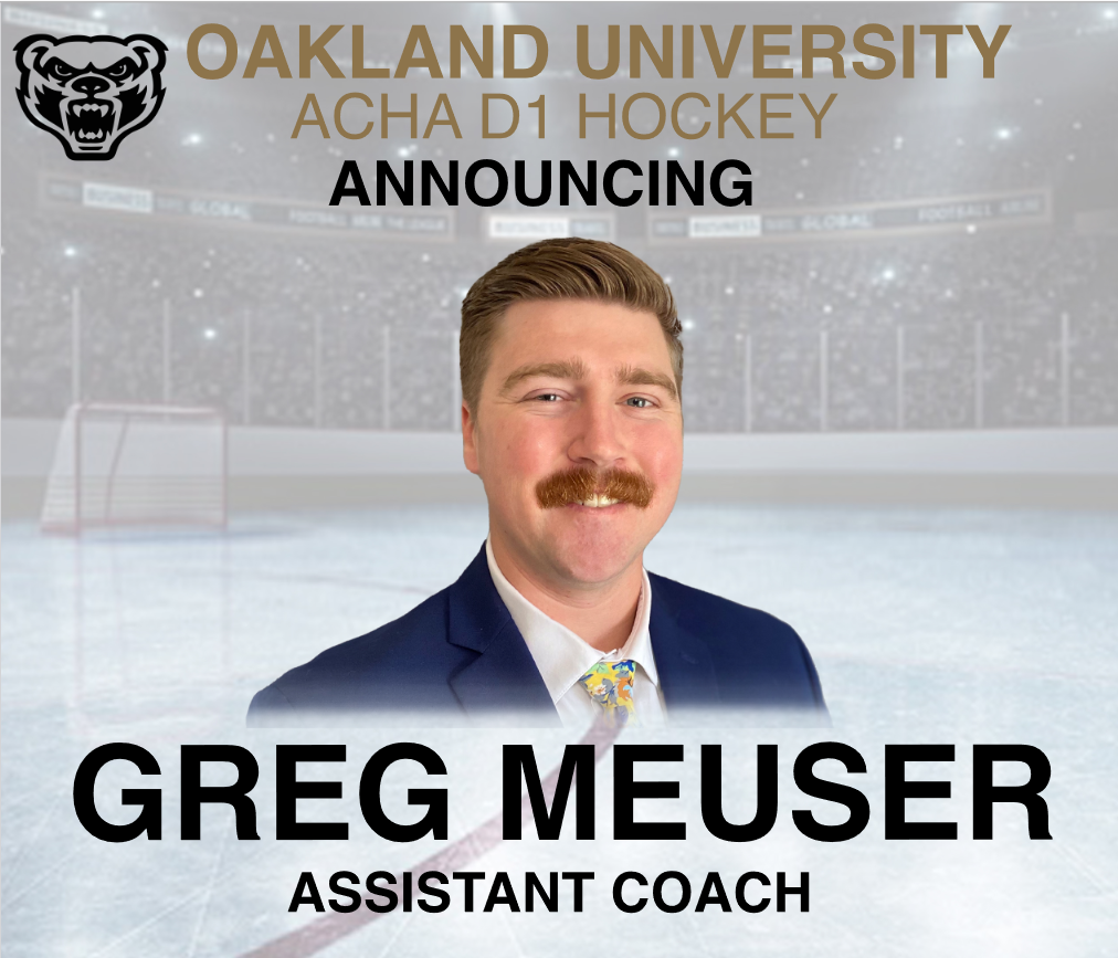 Rochester, MI- Oakland ACHA DI Hockey head coach Nick Mammel has named former Oakland captain Greg Meuser as an assistant coach. Meuser played at Oakland from 2017-2020. He scored 24 goals and 64 points in 96 games at Oakland.