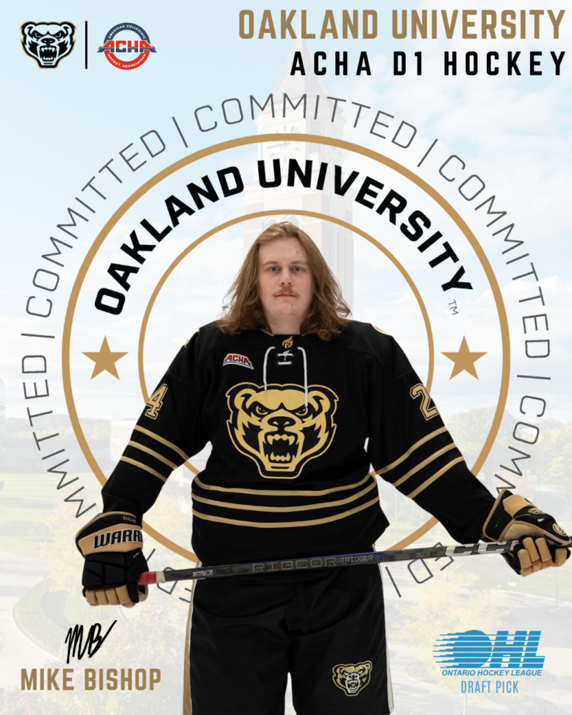 The Oakland ACHA DI Hockey staff was helpful to Bishop throughout his recruiting process. “The staff has been great throughout the process.” Bishop stated. “They’ve been honest and supportive, and they made it clear this is a place where I can grow and contribute.”