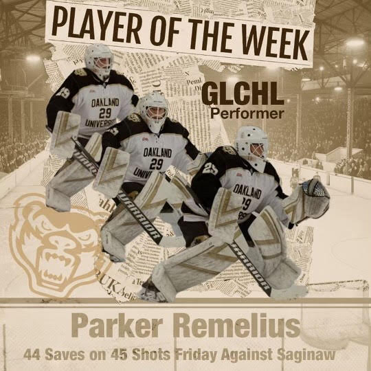 The Great Lakes Collegiate Hockey League (GLCHL) has named Oakland goalie Parker Remelius as one of its weekly GLCHL Performers (players of the week).